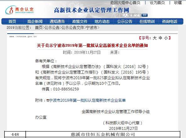 After May to June 2019, the local newspaper, the national newspaper network newspaper, and the district and county science and technology bureaus and the national tax inspection and recommendation from July to September, the high-tech enterprise evaluation expert group conducted on-site audits, and reviewed and inspected the compliance, integrity, authenticity and effectiveness of high-tech enterprises. Fully affirmed the research and development organization and management level of Jiaheng Company's high-tech enterprises, and unanimously agreed to recommend them to Ningbo High-tech Enterprise Evaluation Working Committee. After the Ningbo Evaluation Comm
